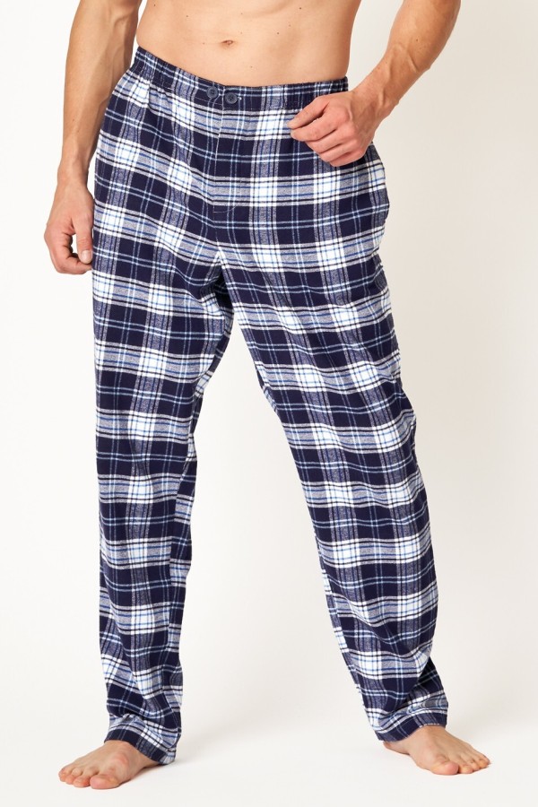 Pantalon de pijama pentru barbati confectionat din flanel pentru a va asigura o senzatie de caldura si confort. Pantalonul este lung, are talie elastica confortabila ce se fixeaza cu nasturi, prezinta model deosebit cu carouri si este prevazut cu buzunare laterale.