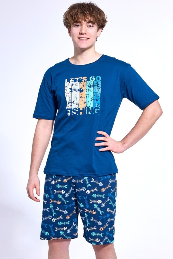 Pijama pentru adolescenti realizata din bumbac de inalta calitate, extrem de moale si de placut la atingere. Pijamaua este compusa din 2 piese. Bluza are maneca scurta, decolteu rotund si este infrumusetata pe partea frontala cu un imprimeu deosebit, precum si cu inscriptia "Let s go fishing". Pantalonul este scurt, are talie elastica confortabila si prezinta model colorat cu oase de peste.