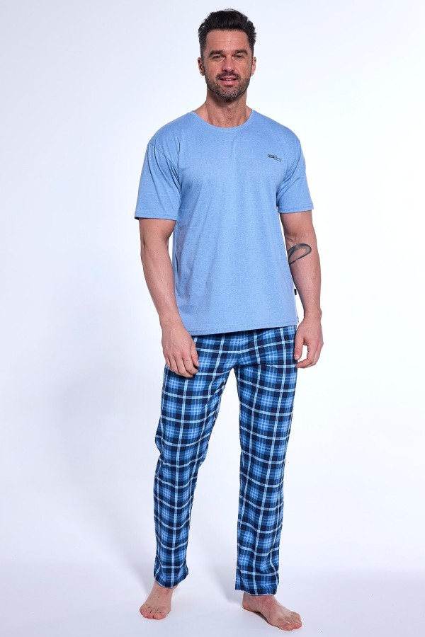 Pijama pentru barbati realizata din bumbac de inalta calitate, compusa din 2 piese. Bluza este confectionata din tesatura melanj, are maneca scurta, decolteu rotund si este infrumusetata in zona pieptului cu inscriptia "Stay strong", iar pantalonul este lung, are talie elastica confortabila si prezinta model deosebit cu carouri.