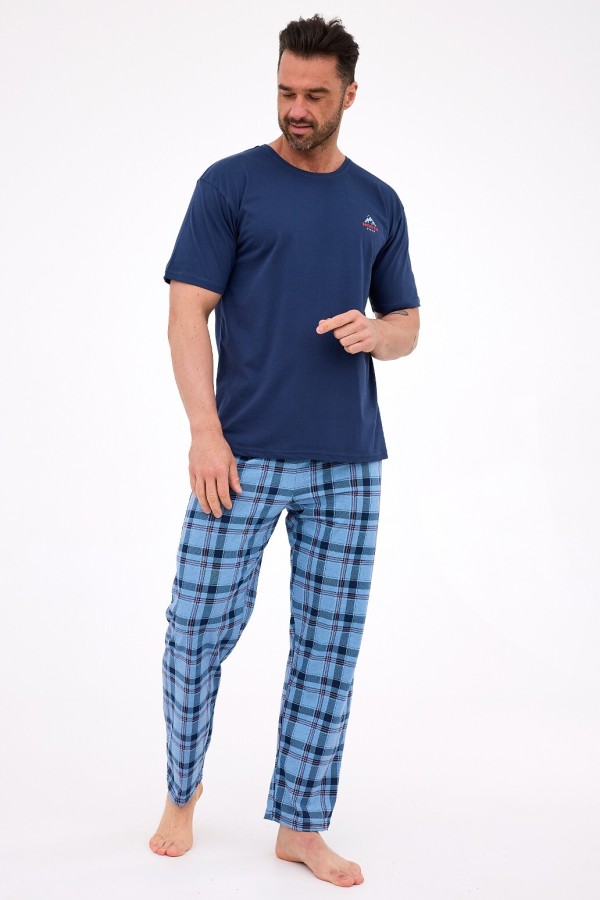 Pijama pentru barbati realizata din bumbac de inalta calitate, compusa din 2 piese. Bluza are maneca scurta, decolteu rotund si este infrumusetata in zona pieptului cu un imprimeu mic cu un varf de munte, precum si cu inscriptii subtile, iar pantalonul este lung, are talie elastica confortabila si prezinta model deosebit cu carouri.