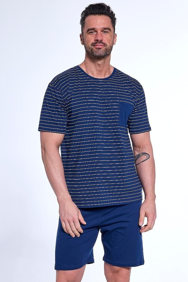 Pijama pentru barbati realizata din bumbac de inalta calitate. Pijamaua este compusa din 2 piese. Bluza are maneca scurta, decolteu rotund, prezinta model deosebit cu dungi subtiri si este prevazuta in zona pieptului cu un buzunar din material in nuanta pantalonului, iar pantalonul este scurt, uni si are talie elastica confortabila.
