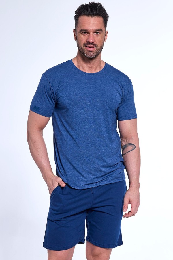 Pijama pentru barbati realizata din modal (vascoza de inalta calitate) in combinatie cu bumbac placut la atingere si fibre elastice. Pijamaua este compusa din 2 piese. Bluza este confectionata din tesatura melanj, are maneca scurta si decolteu rotund, iar pantalonul este scurt, are talie elastica confortabila a carei circumferinta se poate ajusta cu ajutorul unui siret si este prevazut cu buzunare laterale.