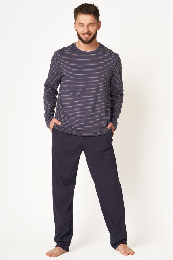 Pijama pentru barbati realizata din bumbac de inalta calitate, cu proprietati antialergice. Pijamaua este compusa din 2 piese. Bluza are maneca lunga, decolteu rotund finisat cu insertie de material in nuanta contrastanta si prezinta model deosebit cu dungi colorate. Pantalonul este lung, uni, are talie elastica confortabila ce se ajusteaza cu ajutorul unui snur si este prevazut cu buzunare laterale.