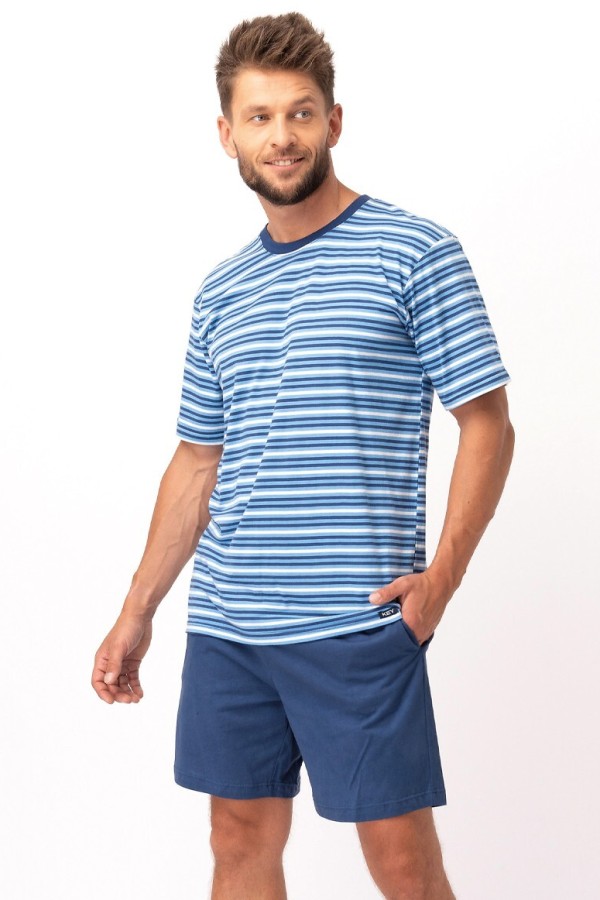 Pijama pentru barbati realizata din bumbac de inalta calitate, cu proprietati antialergice. Pijamaua este compusa din 2 piese. Bluza are maneca scurta, decolteu rotund finisat cu insertie de material in nuanta pantalonului si prezinta model deosebit cu dungi. Pantalonul este scurt, uni, are talie elastica confortabila a carei circumferinta se poate ajusta cu ajutorul unui siret si este prevazut cu buzunare laterale.