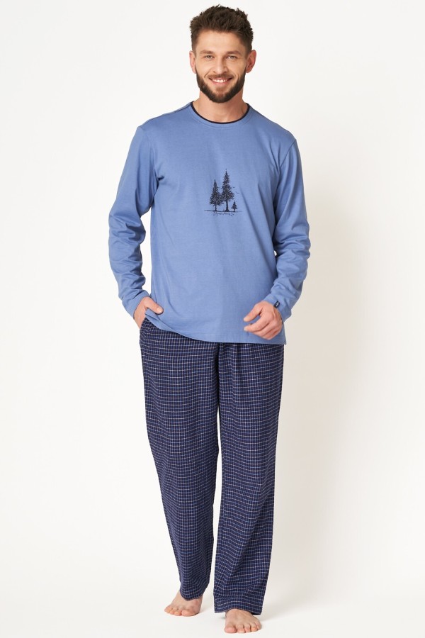 Pijama pentru barbati realizata din bumbac de inalta calitate, cu proprietati antialergice. Pijamaua este compusa din 2 piese. Bluza are maneca lunga, decolteu rotund finisat cu insertie de material in nuanta contrastanta si este infrumusetata pe partea frontala cu imprimeu cu trei brazi, precum si cu inscriptia "Forest family". Pantalonul este lung, confectionat din flanel pentru a va asigura o senzatie de caldura si confort, are talie elastica confortabila a carei circumferinta se ajusteaza cu ajutorul unui siret, prezinta model cu carouri si este prevazut cu buzunare laterale.