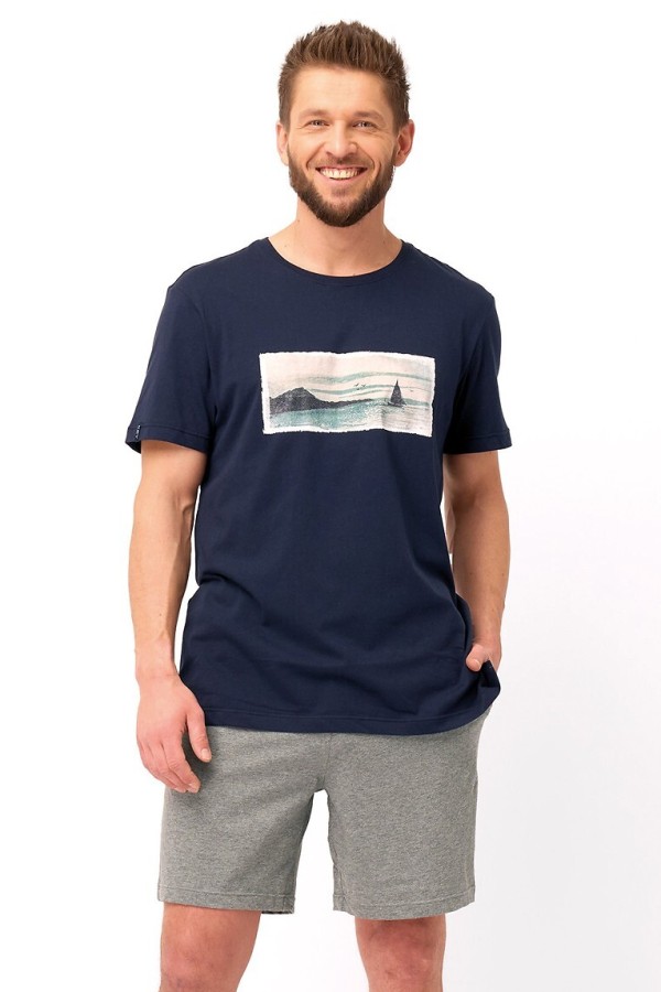 Pijama pentru barbati realizata din bumbac de inalta calitate, cu proprietati antialergice. Pijamaua este compusa din 2 piese. Bluza are maneca scurta, decolteu semirotund si este infrumusetata pe partea frontala cu un imprimeu marin, iar pantalonul este scurt, melanj, are talie elastica confortabila si este prevazut cu buzunare laterale.