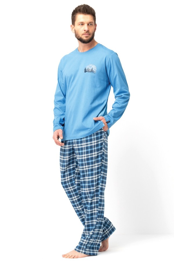 Pijama pentru barbati realizata din bumbac de inalta calitate, cu proprietati antialergice. Pijamaua este compusa din 2 piese. Bluza are maneca lunga, decolteu rotund si este infrumusetata in zona pieptului cu un imprimeu montan, precum si cu inscriptia "Pieniny". Pantalonul este lung, confectionat din flanel pentru a va asigura o senzatie de caldura si confort, are talie elastica confortabila a carei circumferinta se ajusteaza cu ajutorul unui siret, prezinta model cu carouri si este prevazut cu buzunare laterale.