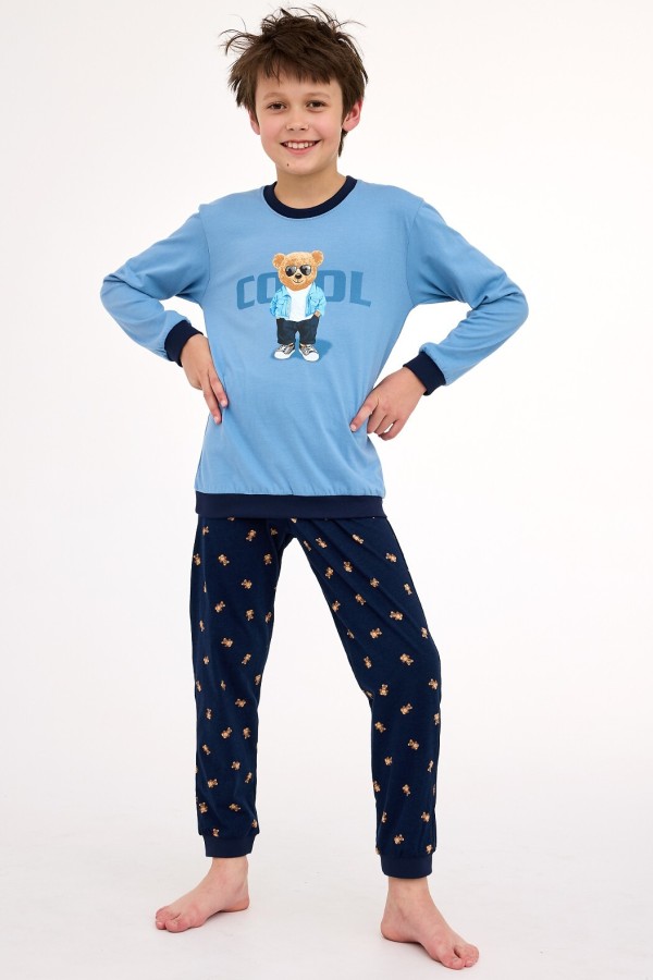 Pijama pentru baieti realizata din bumbac de inalta calitate, extrem de moale si de placut la atingere. Pijamaua este compusa din 2 piese. Bluza are maneca lunga finisata cu manseta, decolteu rotund si este infrumusetata pe partea frontala cu un imprimeu colorat cu un urs de plus modern, precum si cu inscriptia "Cool". Pantalonul este lung, prezinta model deosebit cu ursuleti de plus si este finisat in partea inferioara cu mansete uni. Mansetele, partea de jos a bluzei si decolteul sunt realizate din material in nuanta contrastanta.