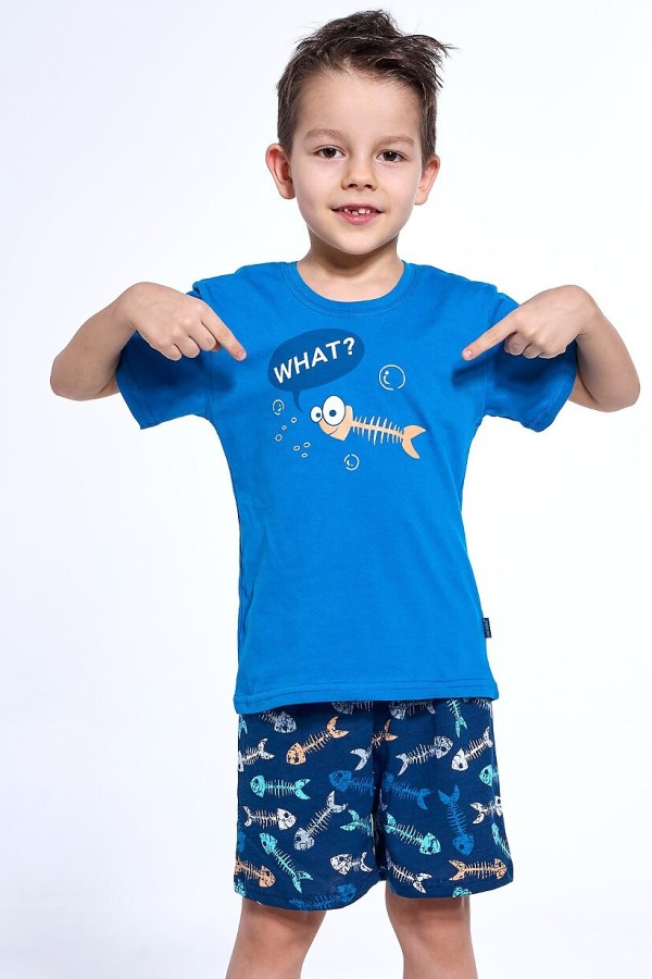 Pijama pentru baieti realizata din bumbac de inalta calitate. Pijamaua este compusa din 2 piese. Bluza are maneca scurta, decolteu rotund si este infrumusetata pe partea frontala cu un imprimeu deosebit cu un schelet de peste, precum si cu inscriptia "What?", iar pantalonul este scurt, are talie elastica confortabila si prezinta model deosebit cu oase de peste.
